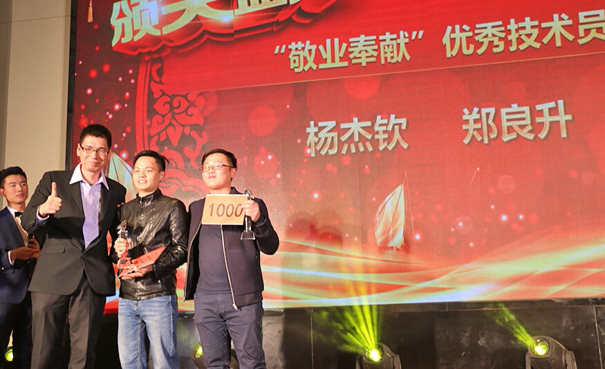 作为整场年会的重头戏,颁奖典礼隆重而喜庆。在阵阵热烈的掌声和欢呼声中,获奖的先进个人和团队一一揭晓,登台领奖。优秀项目经理、优秀工程师、优秀技术员、优秀施工员、优秀实习生、优秀员工、最佳服务之星、最佳长驻明星、最佳外派之星、最佳项目组(大亚湾项目组)、精诚合作奖(深圳团队)、锐意开拓奖(福建团队)、天降雄兵(蓝玛星际),共13组奖项,27位优秀个人,4个先进团队,成为了年会上最闪耀的主角。